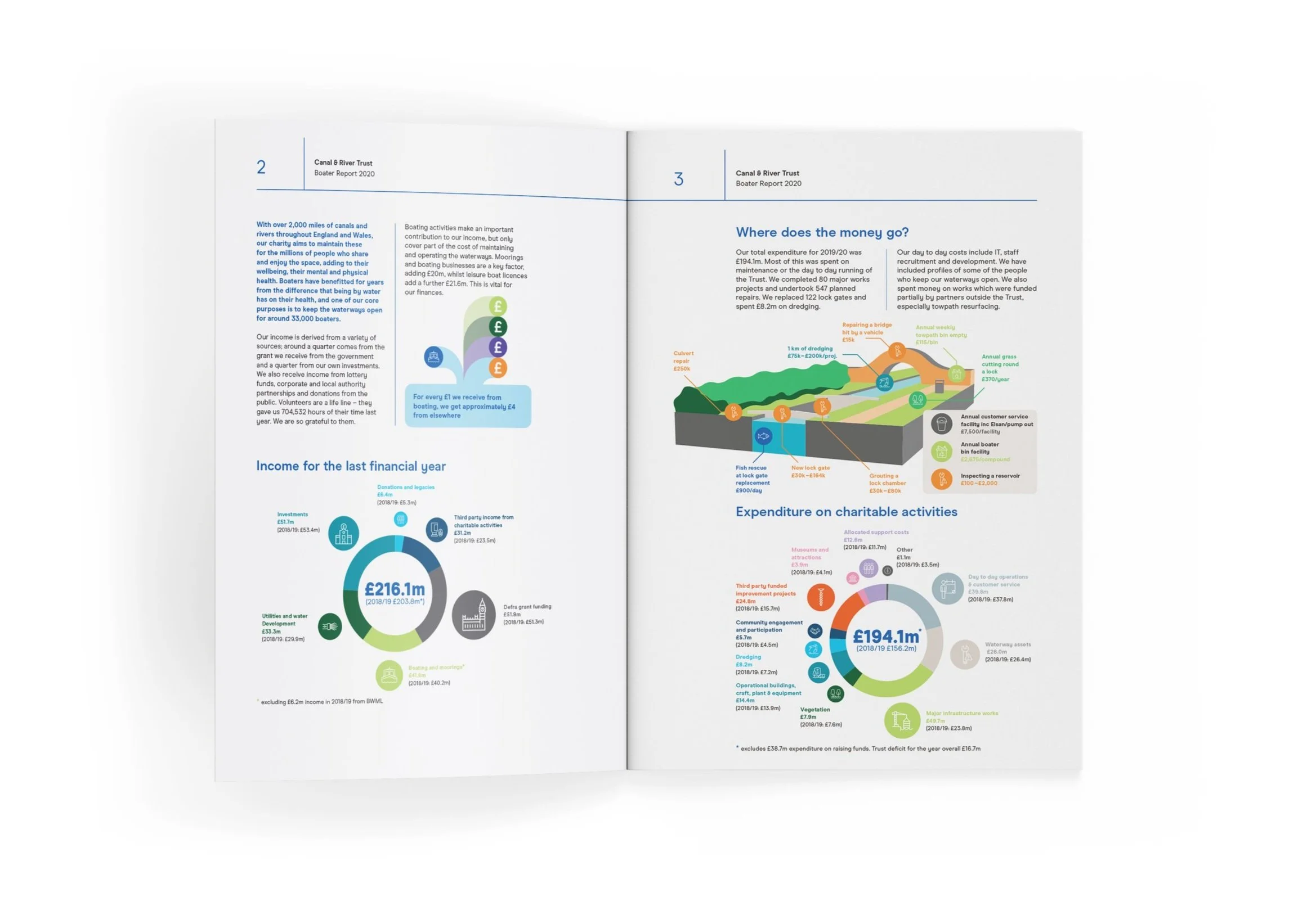 We have worked in partnership with Canal & River Trust on their annual reports since 2013. Each report is designed to reflect the relevant years strategy theme, while reflecting the brand guidelines. The 2018 annual report won the PwC ‘Building Public Trust’ award which celebrates high quality reporting and clarity in strategy, purpose and impact evaluation.