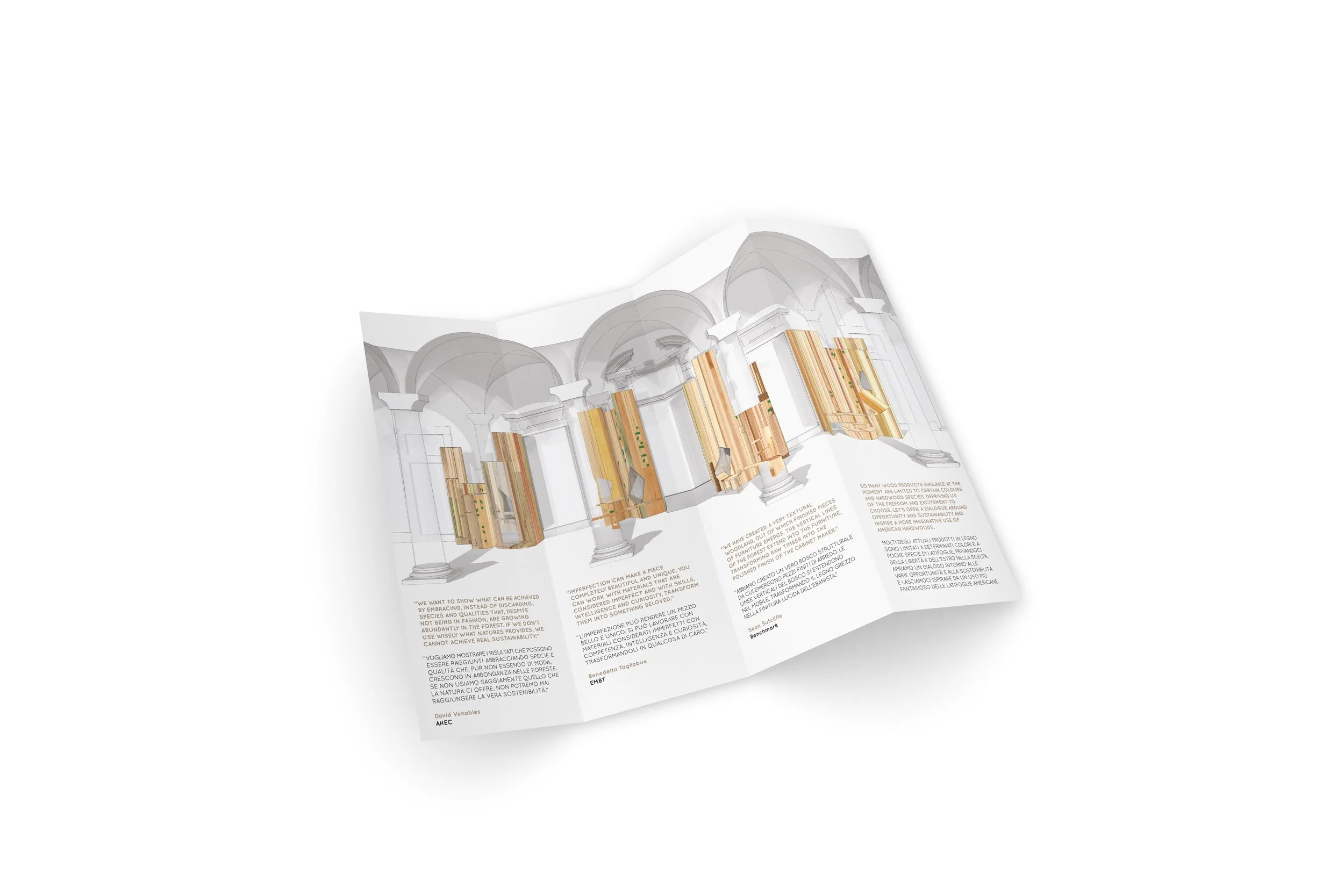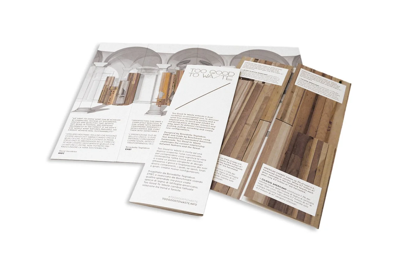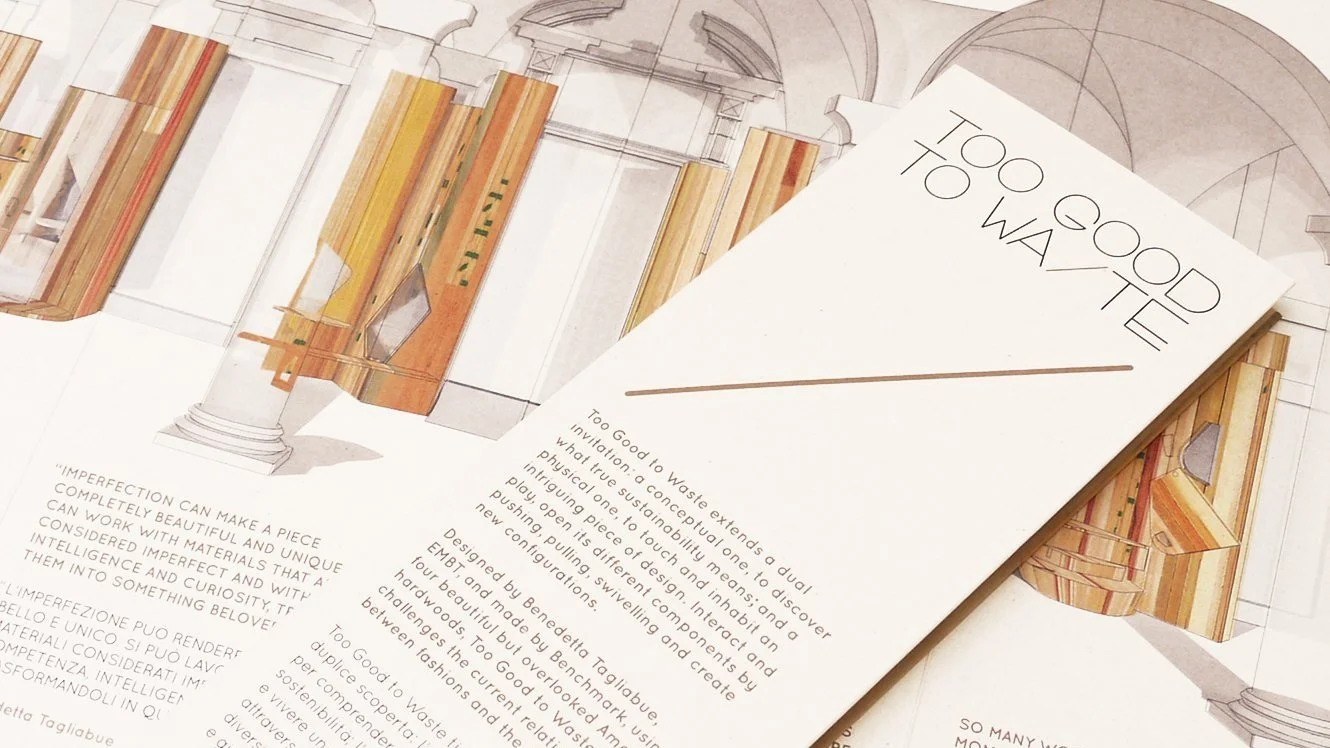 A bilingual gatefold leaflet promoting 'Too good to waste' at Milan Design Week. Reflecting the central message of the project; sustainability and using things that are overlooked, we selected a beautiful paper stock that is made using polluting algal blooms of the Venice Lagoon.