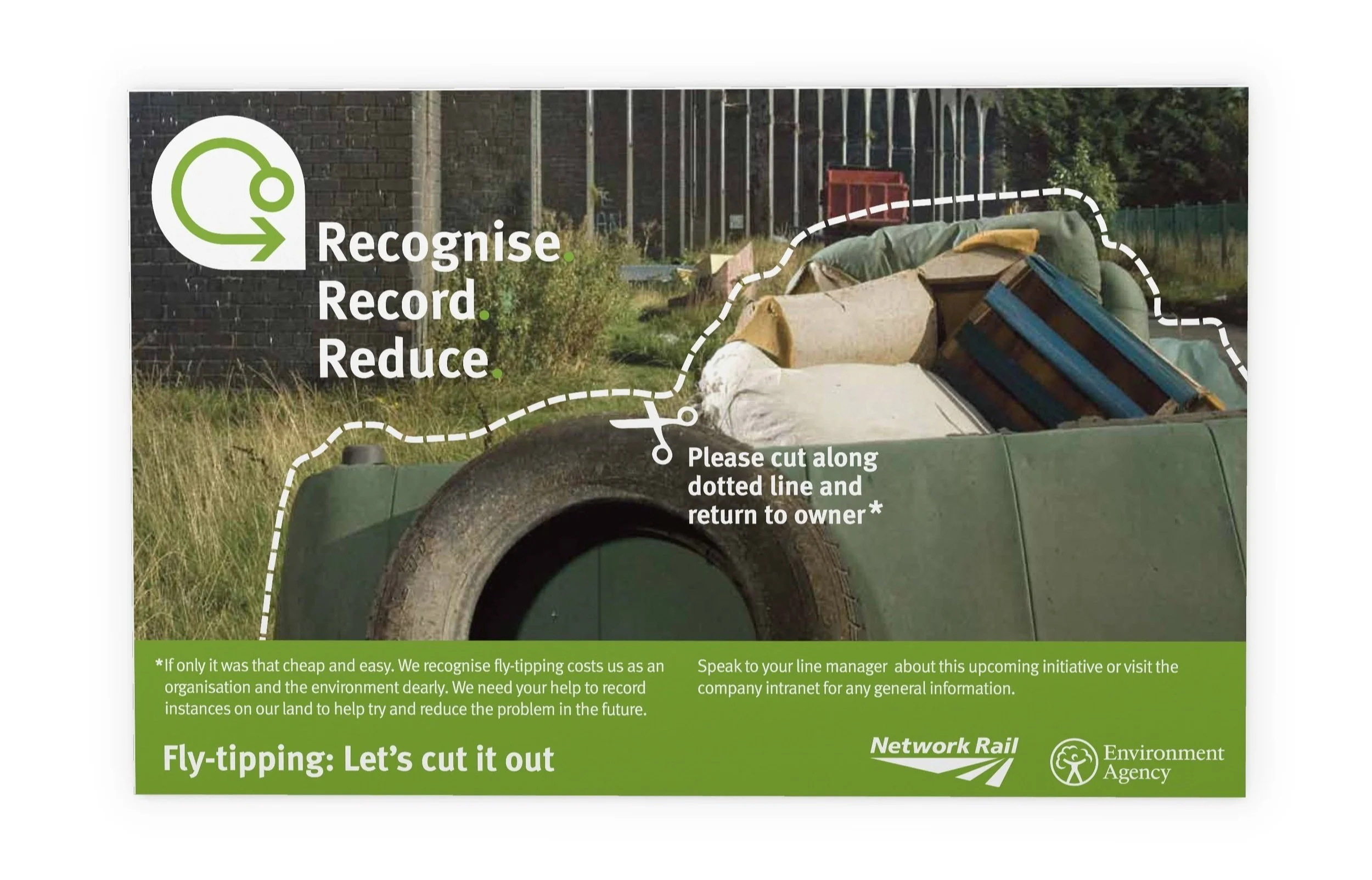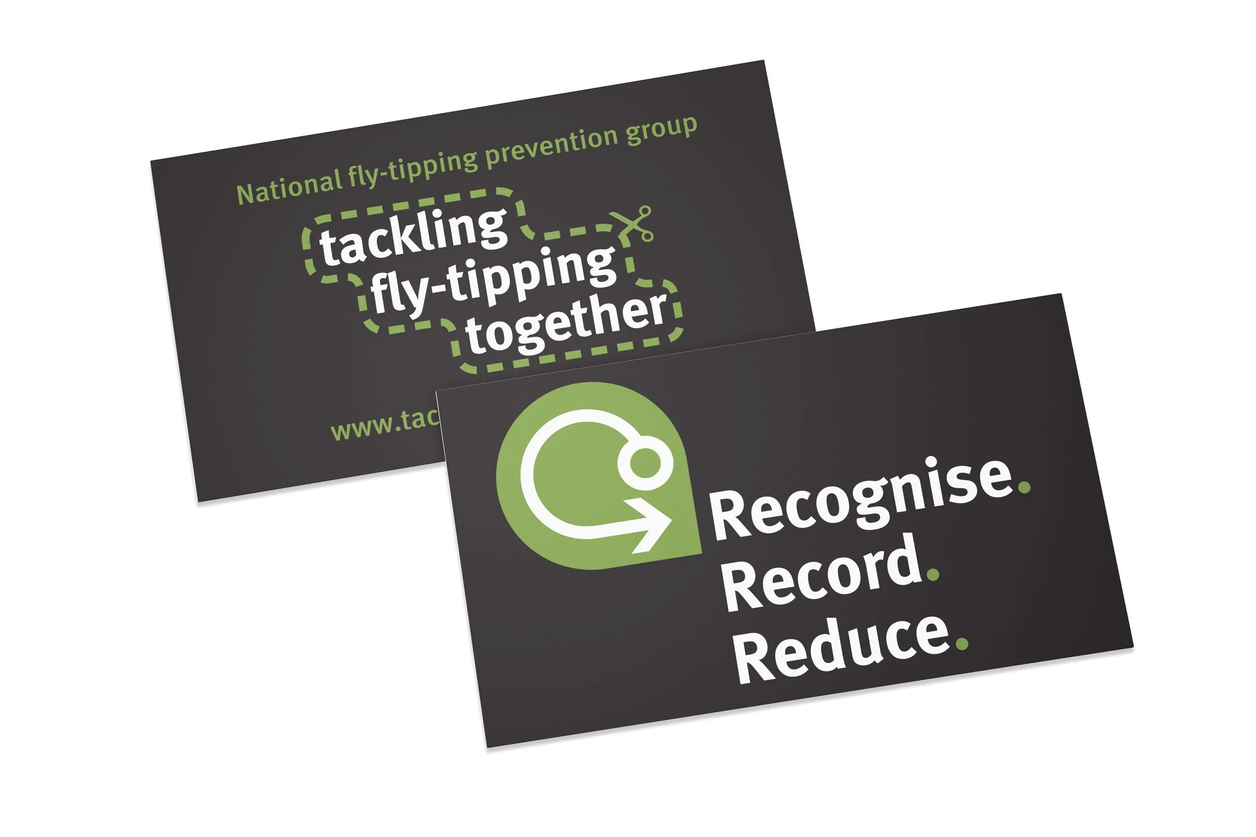 The DEFRA funded WCIP (Waste Crime Innovation Programme) campaign aimed to reduce fly-tipping on private land. The Recognise. Record. Reduce. campaign naming, identity and online activities were supported by printed deliverables including guidance notes with printed recycled tyre covers, vehicle air fresheners, partner invites, promotional leaflets, local press ads, national magazine ads and research-finding booklets.