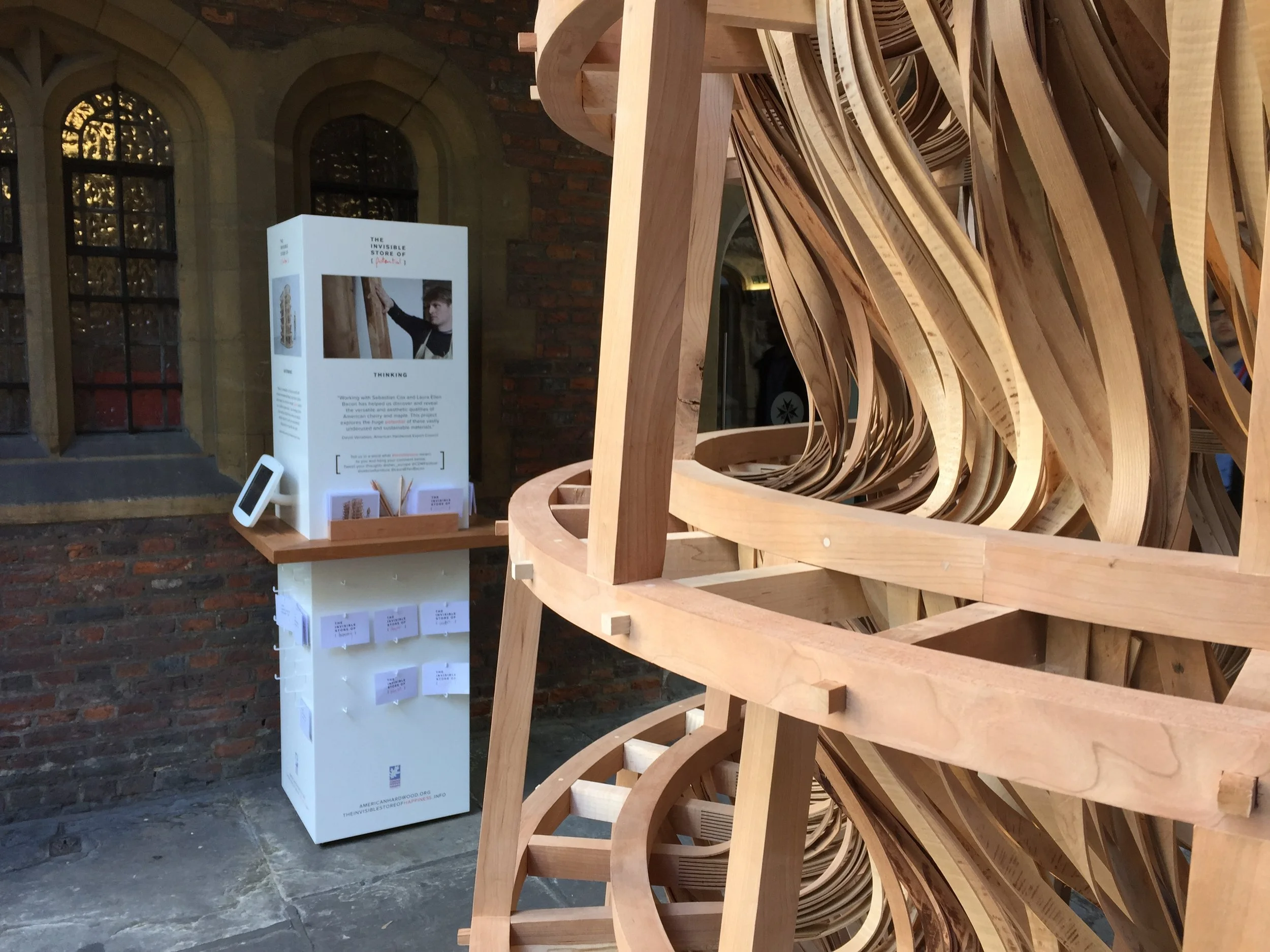 Leaflets and postcards designed to promote and encourage visitor engagement at ‘The Invisible Store of Happiness’ installation at Clerkenwell Design Week, promoting the sustainable qualities of American cherry and maple.