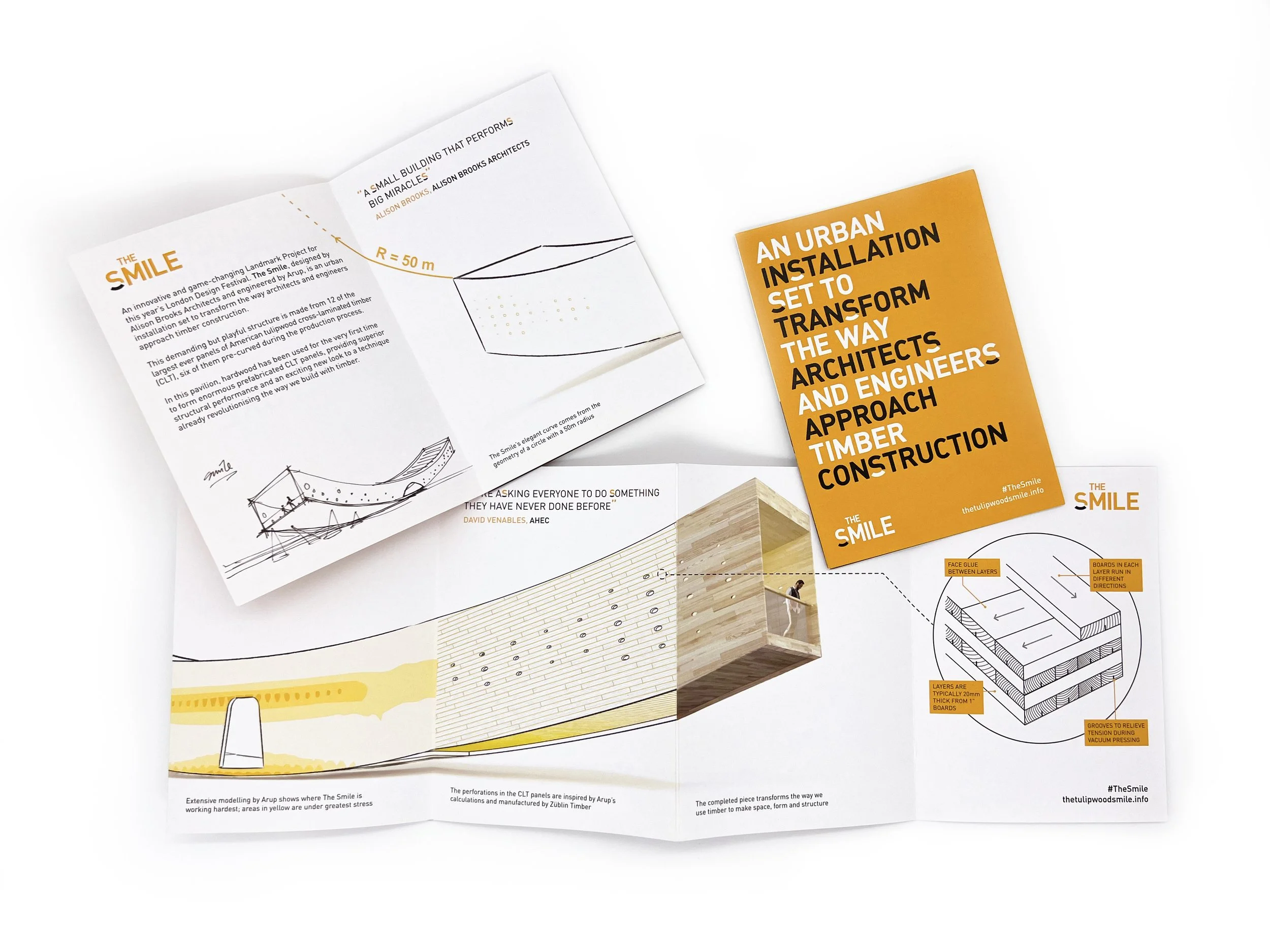 We designed the identity of The Smile: an ambitious, exciting architectural project inspired by American Hardwood Export Council for London Design Week 2016. The shape of the installation is reflected in the logo. A promotional leaflet, graphics and a website provide detailed insight into the materials, design process and production of this 20m long curved wooden installation.